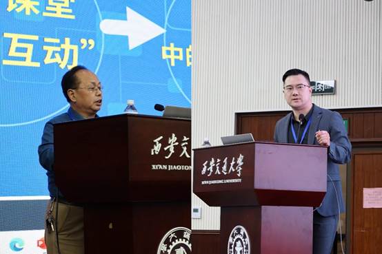 9月21日下午的两场主旨演讲前,西安交通大学附属小学的学生为大会带来了充满三秦文化特色的秦腔《裱花》表演,展现了地方戏曲的独特魅力,赢得了观众的热烈掌声。随后,武和平教授发表了关于基于虚拟智能体的二语课堂互动设计的主旨演讲。他强调虚拟智能体可以通过实时互动与反馈,提升二语学习者的语言能力,特别是在促进准确性和流利度方面具有显著效果。接着,高洋研究员探讨了数智时代下外语教师和学生在情感与AI素养信念上的差异。他指出,教师在自我效能感和AI素养上表现较强,而学生在AI辅助学习中容易产生焦虑感,亟需提升AI素养以适应新时代的外语学习环境。