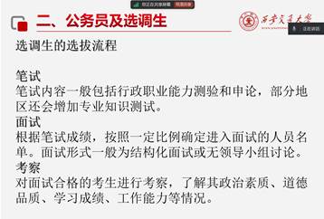 针对较多同学想了解的选调生考试,苏佳宁同学也分享了选拔流程和考试题型,定向选调生选拔流程通常包括发布公告、报名、资格审查、笔试、面试、考察、体检,最后根据考察和体检结果确定拟录用人员并公示,公示无异议后办理录用手续。笔试内容一般包括行政职业能力测验和申论,面试形式一般为结构化面试或无领导小组讨论。