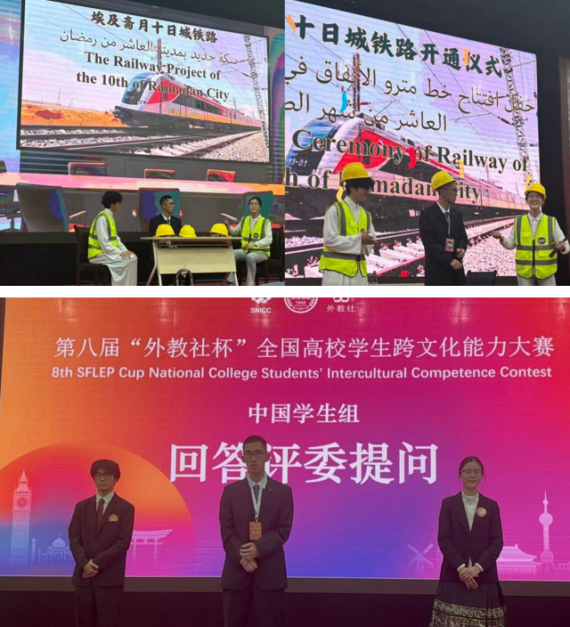 在本届比赛中,我校代表队紧扣“一带一路”倡议背景,以中国援建埃及“斋月十日城”铁路项目为题材,生动讲述了中埃两国在合作进程中文化交融、民心相通的感人故事,深刻诠释了中华民族包容、守信、合作与奉献的精神品格。选手们在场上理论扎实、逻辑清晰、语言流畅、配合默契,其卓越表现赢得了评委的高度认可,充分展现了我校在跨文化交际人才培养和思政育人方面的深厚底蕴与扎实成效。