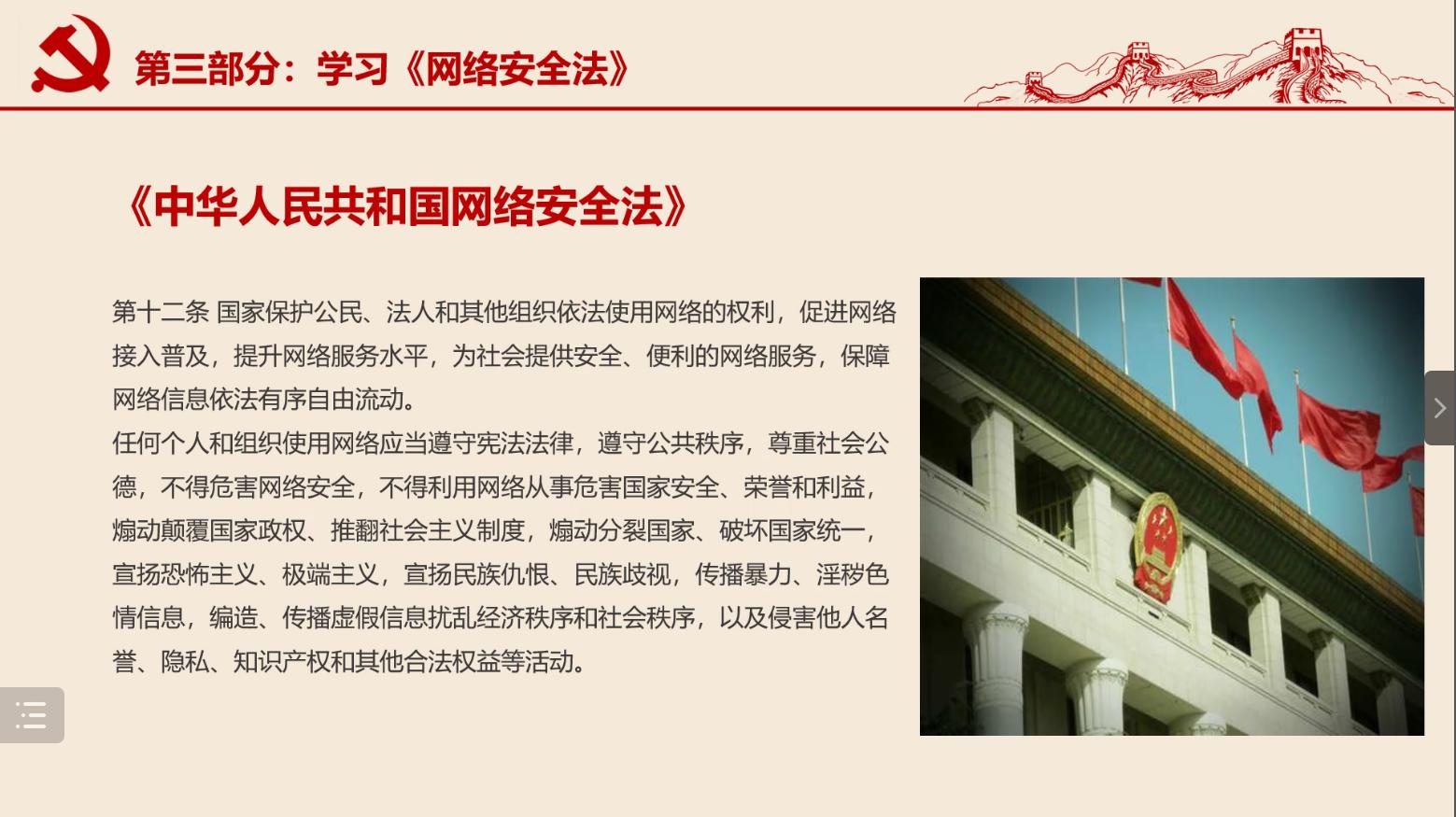 接下来,同志们一起学习《中华人民共和国网络安全法》和《西安交通大学学生违纪处分办法》,强化法治素养,提高辨别网络信息的能力,做到不信谣、不传谣,自觉营造清朗网络环境,合法合理表达个人诉求。