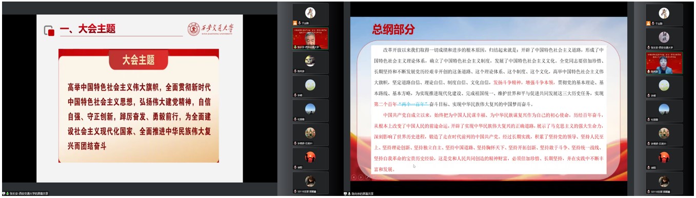 会上研讨交流环节,教工党支部书记杜丽霞、邹郝晶和无党派人士代表桑仲刚教授围绕学院人才培养、专业建设、学科发展、科学研究、课程思政建设等方面谈到进一步引导学生站稳中国立场,传播中国优秀文化,讲好中国故事。本硕学生党团支部书记左灿然、刘银萍、陈沛琪、杨文嘉表示作为新时代青年和党团干部要带领广大青年学子深入领会党的二十大精神,在学习科研中践行党的二十大精神,努力成为通外语、精专业、重实践的复合型创新型应用型人才,为以中国式现代化全面推进中华民族伟大复兴踔厉奋斗。