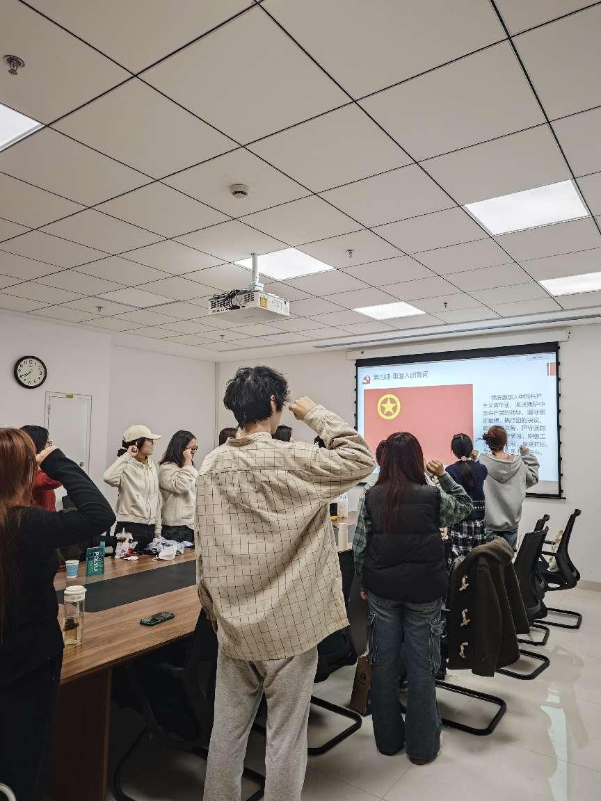 最后,“我志愿加入中国共产主义青年团……”全体团员庄严举起右拳,铿锵有力的誓言响彻会场。重温誓词,让每一位团员再次感受到肩上的责任与使命,坚定了为共产主义事业奋斗终身的信念。