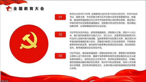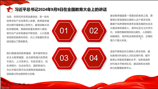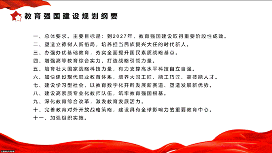 会议第四部分学习了《教育强国建设规划纲要》的核心内容。纲要明确,到2027年我国教育强国建设要取得阶段性成效,提出塑造立德树人新格局、增强高等教育综合实力、培育壮大国家战略科技力量、建设学习型社会、完善教育对外开放战略策略等11项重点内容。