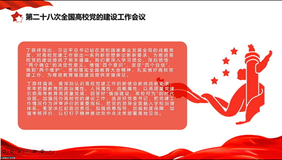 会议第三部分聚焦第二十八次全国高校党的建设工作会议精神。王嘉慧提到,习近平总书记对高校党建工作提出一系列新思想新论断新要求,为推进高校党的建设提供了根本遵循。要以高质量党建引领高等教育高质量发展,牢牢把握高校教育的政治方向,加强党对民办高校的全面领导,把党建工作情况纳入学校评审评价的重要指标。