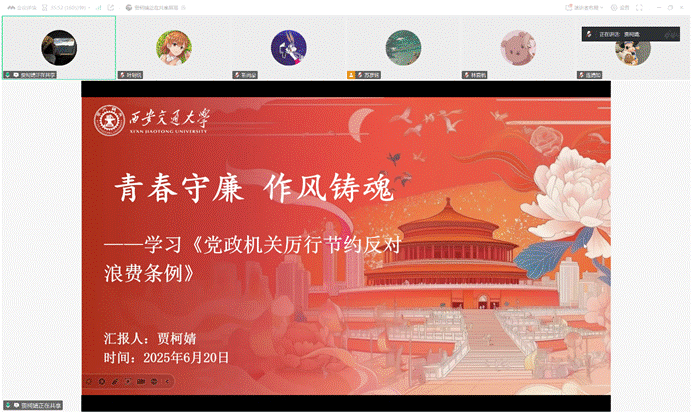 最后,支部书记贾柯婧同志为同志们带来了一节“青春守廉·作风铸魂——学习《党政机关厉行节约反对浪费调理》”的党课。她强调,党和政府带头过紧日子是为了让老百姓过上好日子,条例适用于党政机关、人民团体及参公事业单位,明确了浪费的定义,并指出条例遵循从严从简、依法依规等六大原则,在经费管理、差旅、公务接待等重点领域作出了具体规定。贾柯婧同志以井冈山时期红军艰苦奋斗的实践为例,说明党始终与人民同甘共苦,红色基因在现代通过红色教育基地等方式得到传承。然后,介绍了当代实践与民生成效,以象山县为例,该县把握紧日子和好日子的关系,优先保障民生,提高了群众生活质量。最后,她支部的同志们提出了要求,希望大家在学生时代和未来工作中,都能贯彻落实条例精神,精简会议活动、厉行勤俭节约、做到信息公开透明。